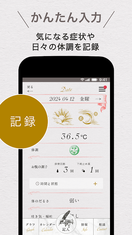 Zarejestrowane informacje są przedstawiane w formie graficznej, dzięki czemu można szybko sprawdzić, kiedy najprawdopodobniej wystąpią działania niepożądane, takie jak biegunka i zmiany w stanie fizycznym, co daje wskazówki, jak sobie z nimi radzić.