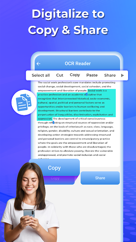 Aplikacja OCR Text Scanner-Image to Text umożliwia użytkownikom skanowanie tekstu z obrazów lub dokumentów fizycznych. Ta aplikacja do skanowania dokumentów wykorzystuje zaawansowane techniki rozpoznawania znaków pisanych na obrazach i konwertowania ich na edytowalny tekst. Aplikacja Document Scanner wykorzystuje aparat telefonu do przechwytywania obrazu dokumentu lub obrazu z galerii, a następnie wykorzystuje technologię OCR w celu wyodrębnienia tekstu i przekształcenia go w tekst nadający się do edycji. Ta aplikacja OCR Text Scanner-Image to Text zapewnia szybki i łatwy sposób przekształcania dokumentów papierowych i obrazów w tekst cyfrowy, ułatwiając edycję tekstu