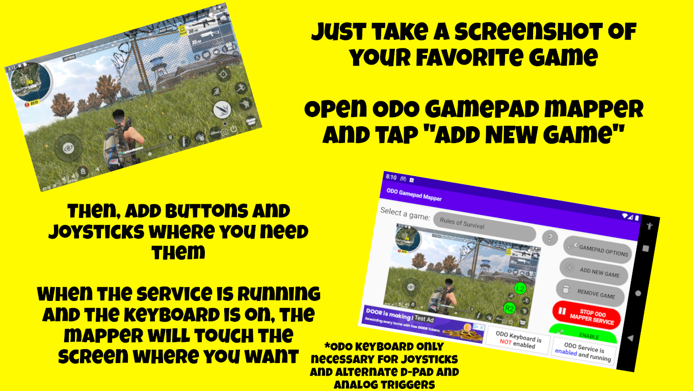 Odo Gamepad Mapper został stworzony, ponieważ nie mogłem zmusić moich gamepadów do współpracy z grami na Androida. Niektóre gry w ogóle nie są zaprojektowane do korzystania z nich, ale grałem w gry, które powinny z nimi działać, tylko niektóre przyciski nie działały. Na przykład: w Regułach przetrwania mogę używać wszystkich przycisków oprócz dwóch wyzwalaczy, które naprawdę musisz popracować, aby zagrać w grę. W Ark Survival Evolved pad kierunkowy nie działa, ale pozostałe przyciski działają. Zrobiłem więc tę aplikację, aby umożliwić mi zmianę tych brakujących przycisków na dotknięcia ekranu. Nie było to łatwe, ale pałki analogowe też działały, ale są pewne problemy, szczególnie jeśli masz Androida 7 (Nougat). Nie jest potrzebny dostęp do roota. Ta aplikacja jest skonfigurowana jako usługa ułatwień dostępu, która odczytuje naciśnięcia przycisków i może wprowadzać zdarzenia dotykowe, więc usługa musi być uruchomiona, aby działać.