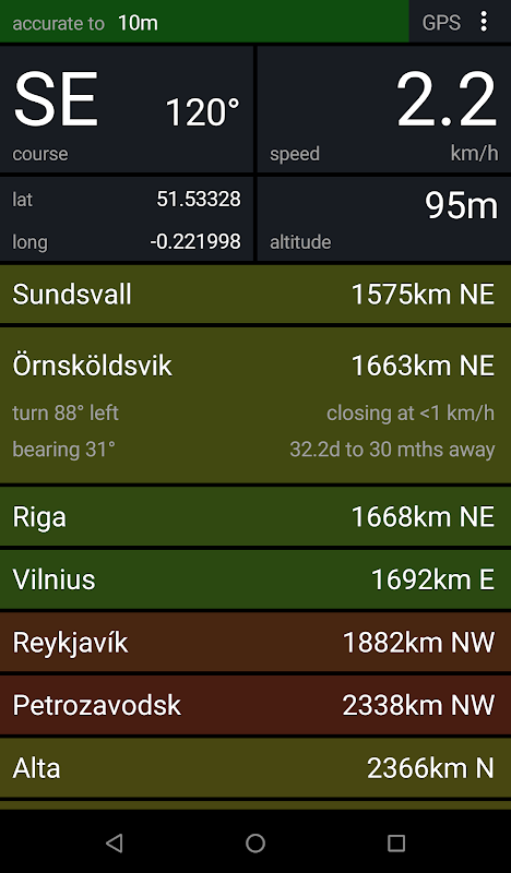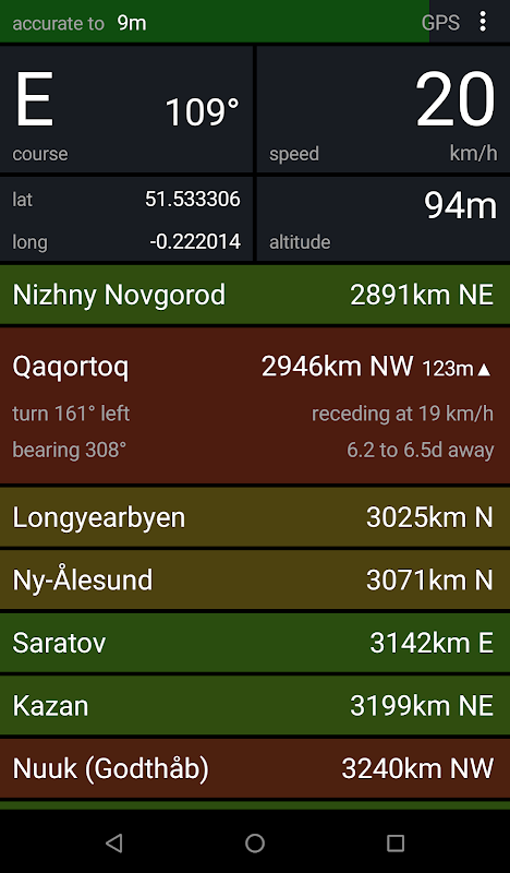 • Informuje, jak daleko są twoje lokalizacje. Używa kolorów, aby pokazać, czy jesteś coraz bliżej czy dalej.