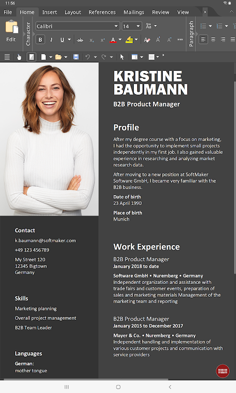 Intuicyjna obsługa na smartfonach i tabletach: TextMaker zawsze zapewnia użytkownikowi wygodę — niezależnie od tego, czy jest używany na smartfonie, czy tablecie. Na telefonie można korzystać z praktycznych pasków narzędzi, obsługiwanych jednym palcem. Na tablecie pracuje się ze wstążkami podobnymi do tych na komputerze.