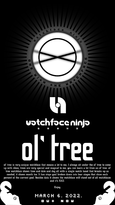 Wynalazłem ninja z tarczą zegarka | Vinyl Time System™ z powrotem w zimie 2019 r., zaimplementowałem go tylko na jednej tarczy zegarka od „ORYGINALNEGO” i tutaj pojawia się ponownie ze starym drzewem. stare drzewo to bardzo wyjątkowa tarcza zegarka, która wiele dla mnie znaczy, zawsze siedzę pod starym drzewem, aby wymyślać pomysły, drzewa są dla mnie bardzo wyjątkowe i magiczne, można się wiele nauczyć od starego drzewa. ol' tree watchface pokazuje czas, datę i dzień za pomocą jednej wskazówki zegarka, która rozpada się w razie potrzeby, pokazuje też miesiąc. Ma cel kroków podzielony na cztery etapy, które pokazują każdy procent bieżącego celu. Oprócz danych pokazuje, że tarcza zegarka będzie wyróżniać się spośród wszystkich tarcz zegarka i jest to RAD.
