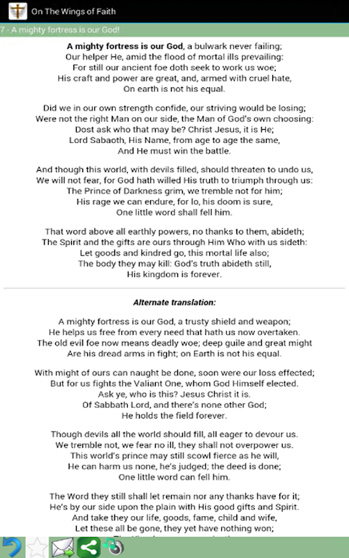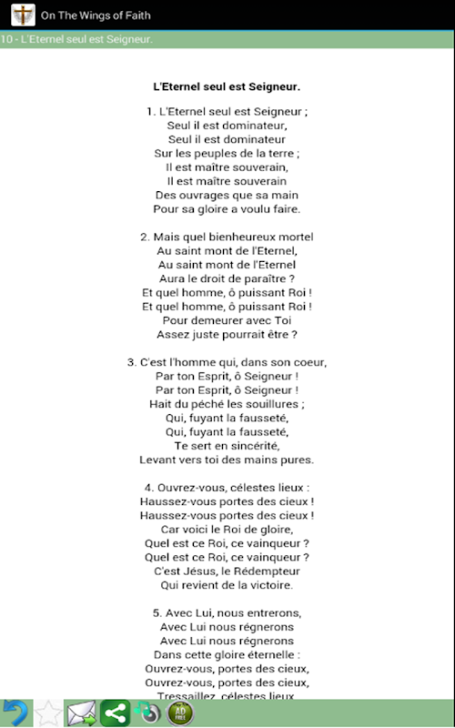 Popularna książka chrześcijański hymn (Sur les Ailes de la Foi) jest już dostępna na końcu swojej strony z tej aplikacji. Wszystkie teksty hymnów, muzyczki są teraz w zasięgu ręki. Wielbić Pana ze wszystkich pięknych hymnów na skrzydłach wiary. Każdy chrześcijanin powinien zainstalować aplikację w celu zwiększenia ich nabożeństwo. Dodatkowa książka Hymn jest wliczone w App.