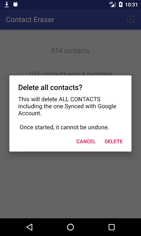 Aplikacja wymaga READ i WRITE uprawnienie kontakt, aby usunąć wszystkie kontakty.