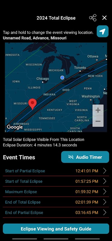 + Minutnik: Nigdy nie przegapisz żadnej chwili, odliczając do sekundy, aż cień księżyca dotknie zachodniego wybrzeża Ameryki Północnej. Dynamiczny zegar odliczający zaćmienie informuje Cię o podróży cienia i dotarciu do Twojej lokalizacji.
