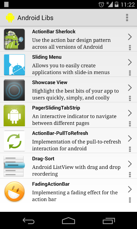 This application contains a collection of information on various Useful third party open source android libraries. This app is a created specially for developers. The goal of this app is to save developer's time in doing research work on open source android library projects.