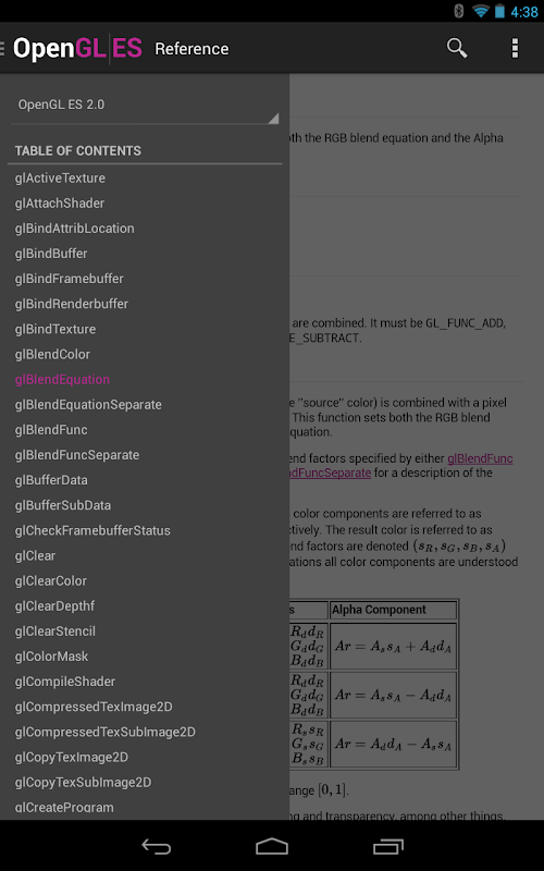 This app provides the best reading experience for the OpenGL ES reference pages on your phone or tablet.