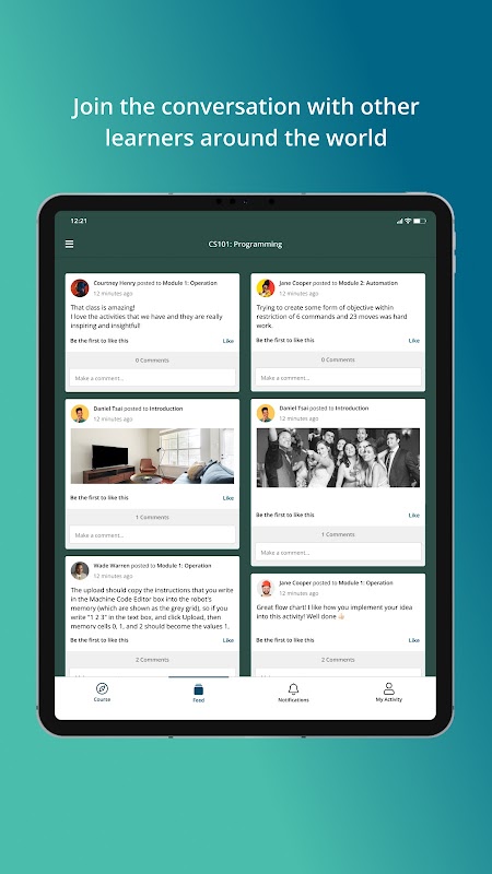 Wykonaj modułów w swoim własnym tempie, w dowolnym miejscu. Dowiedz się razem poprzez połączenie działania, pracując na projektach grupowych, dzieląc się pomysłami i rozmowy z innymi studentami.