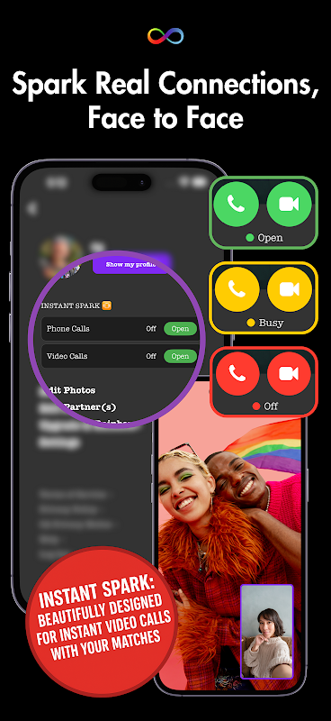 • Natychmiastowe iskry przez dotknięcie, aby zadzwonić: Włącz tryb telefonu lub wideo, aby członkowie Rainbow+ online mogli się z Tobą połączyć za pomocą połączeń wideo lub telefonicznych. Ustaw swój telefon lub status wideo na „Otwarte” w dowolnym momencie i uzyskaj natychmiastowe iskry od swoich dopasowań. Zacznij od przyjacielskich rozmów, a jeśli masz na to ochotę, włącz też kamerę.
