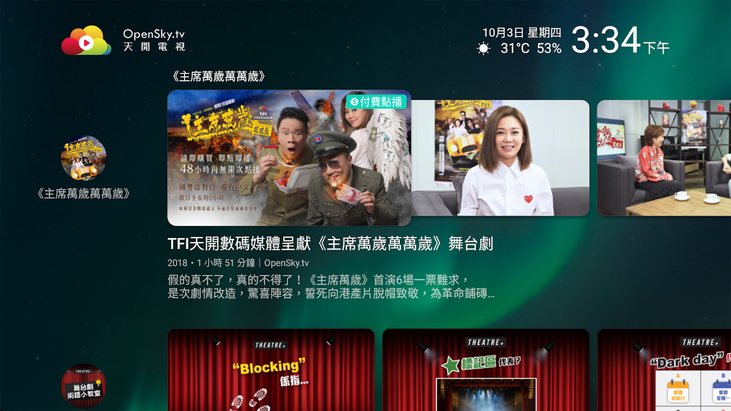 OpenSky破天荒與舞台劇界合作,打造全港首個舞台劇視頻平台,致力推廣戲劇文化。我們積極搜羅優質戲劇作品,為舞台劇迷提供最全面劇訊。同時,為提供更豐富及多元化內容推介,OpenSky亦會繼續精選娛樂盛事,讓本地及全球觀眾同步欣賞高質素的視頻直播及點播,配合智能內容推介技術,帶來嶄新跨平台地域的視聽娛樂新體驗!