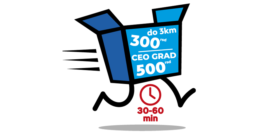 Naš tim profesionalnih vozača i ljubaznih dispečera će se potruditi da Vam u roku od 30 do max 60 min dostave Vasu porudžbinu.