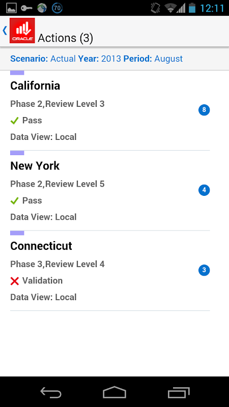 Oracle Enterprise Performance Management (EPM) Mobile provides users of Hyperion Financial Management, Hyperion Planning, and Hyperion Tax Provision with easy access to key business information for faster decision-making and improved process flow. EPM Mobile helps on-the-go managers and executives to quickly and easily review, approve, and promote forecasts, budgets, consolidations, and tax provision submissions. EPM Mobile delivers a consistent user experience across EPM applications to your Android-based smartphone.