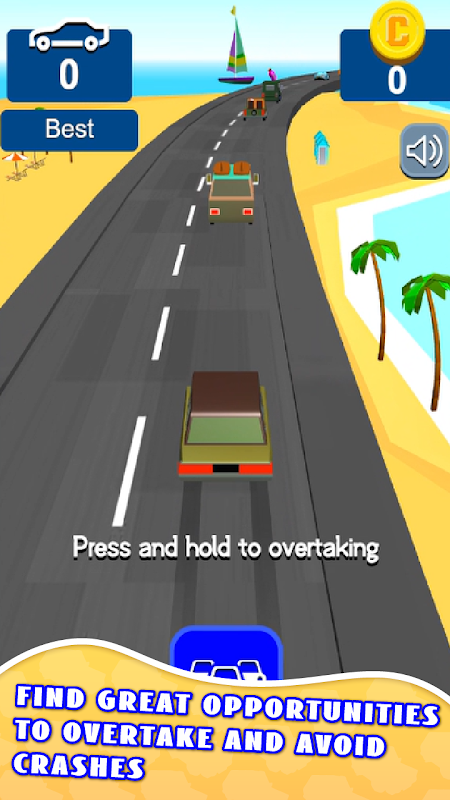 Zachowaj czujność i reaguj szybko — przytrzymaj, aby zmienić pas, precyzyjnie wyczuj czas swoich ruchów i zwolnij, aby wrócić na bezpieczną pozycję. Droga jest pełna wyzwań, a tylko najlepsi kierowcy potrafią opanować sztukę wyprzedzania.