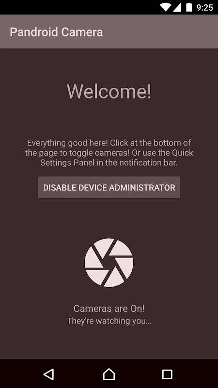 Pandroid Aparat wykorzystuje API Device Administration powiedzieć telefon, że stosowanie kamer jest całkowicie zabronione. Można włączać i wyłączać kamery w aplikacji, lub jeśli jesteś na Nugat lub powyżej, można użyć szybkiego ustawienia płytki.
