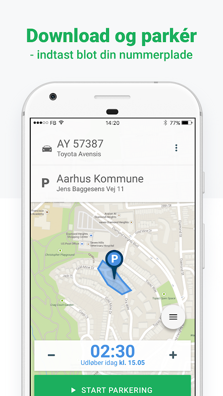 Indtast blot din nummerplade for at komme i gang. Vælg hvor du vil parkere på kortet og indstil ønsket parkeringstid.