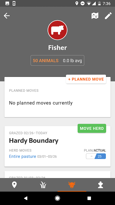 PastureMap działa w trybie offline, gdy jesteś w terenie. Zaloguj się na swoje konto w Internecie, aby zobaczyć panel zarządzania stadem, liczbę dni zwierząt na akr i zobaczyć, jak lokalne dane dotyczące opadów i gleby wpływają na Twoją produktywność.