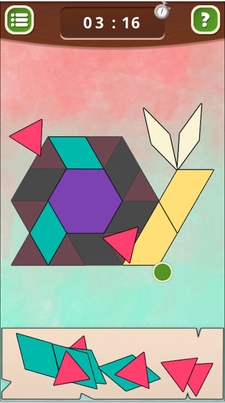 На каждом уровне отображается силуэт узора и набор фигур, вам предстоит подобрать нужную фигуру и указать ей правильный угол. Как только все фигуры будут поставлены на свои места, уровень будет пройден.