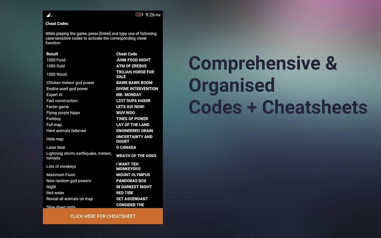 Cheatmachine PC provides the cheat codes & cheatsheets required to unleash hidden features of PC games and to complete them in an easier way with loads of fun. If your game is not mentioned in the list,use the "Search Online" feature. You can request games from the app to get them added in the upcoming updates.