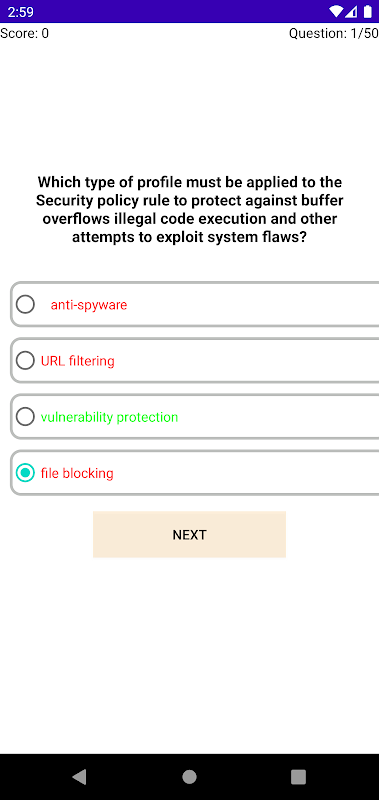 ⭐️ Zastrzeżenie: Pytanie praktyczne do egzaminu PCNSA to niezależna aplikacja, która nie jest powiązana ani wspierana przez firmę Palo Alto Networks ani żadnego zewnętrznego dostawcę certyfikatów. Celem tej aplikacji jest wyłącznie pomaganie użytkownikom w przygotowaniach do egzaminu.