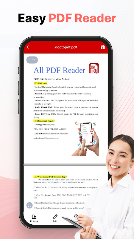 Odblokuj moc funkcji szybkiego przeglądania dokumentów dzięki PDF Reader: Document Viewer — wielofunkcyjny czytnik PDF, przeglądarka PDF i konwerter PDF. Niezależnie od tego, czy czytasz, konwertujesz czy organizujesz pliki PDF, ta aplikacja została stworzona, aby uprościć Twój cyfrowy obieg pracy dzięki szybkości, przejrzystości i inteligentnym narzędziom, takim jak czytnik skanera i przeglądarka dokumentów.
