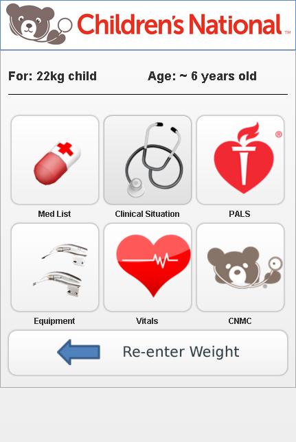 This user friendly mobile application, developed by Children's National Medical Center physicians in the divisions of Emergency and Transport Medicine, provides a quick reference for the vitals, equipment, or dosage guidelines for a pediatric patient.