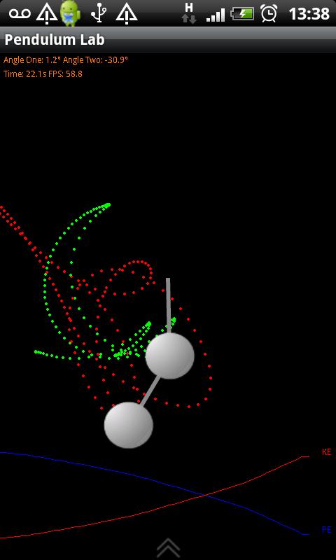 Simulate a chaotic double pendulum in real time on your phone. Create beautiful patterns with the trace feature. You can interact with the pendulum by using the touch screen to drag the masses around. All of the physical parameters are changeable in the preferences.