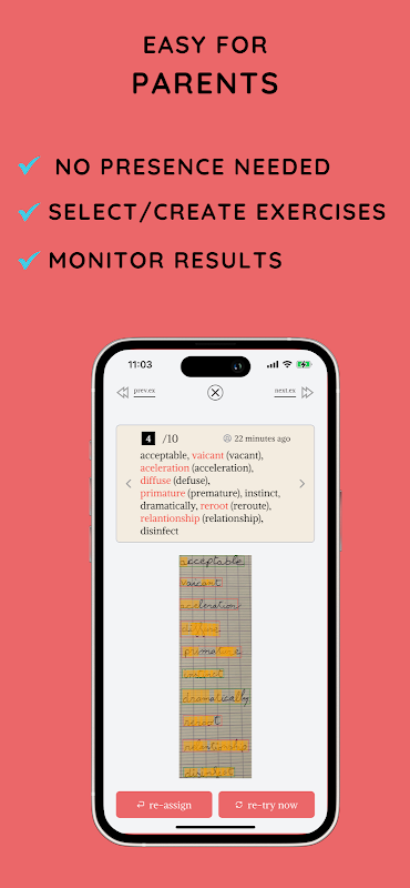 - Informacje zwrotne wspomagane sztuczną inteligencją: korzystając z optycznego rozpoznawania znaków (OCR), aplikacja analizuje zdjęcia odręcznych słów, porównuje je z podyktowaną listą i zapewnia natychmiastowe wyniki i informacje zwrotne.
