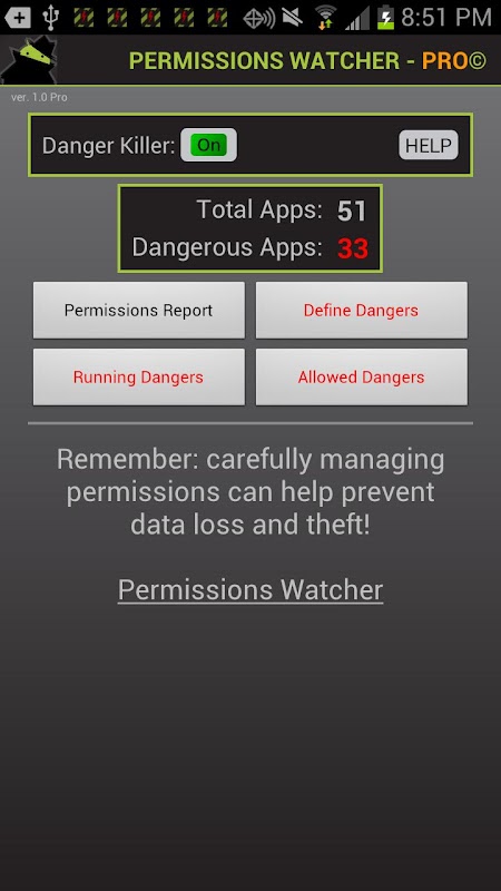 Permissions Watcher Pro was created to address the permissions risks users are exposed to when installing and using applications. When you install an application, you are provided with very little detail regarding the risks and specific use of the various permissions requested by that app. Permissions Watcher was designed to give you total transparency into how each and every application on your device is working with respect to data and permissions.
