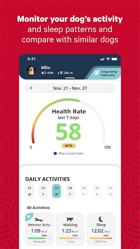 - Monitoruj aktywność swojego zwierzaka, wzorce snu, liczbę kalorii i więcej