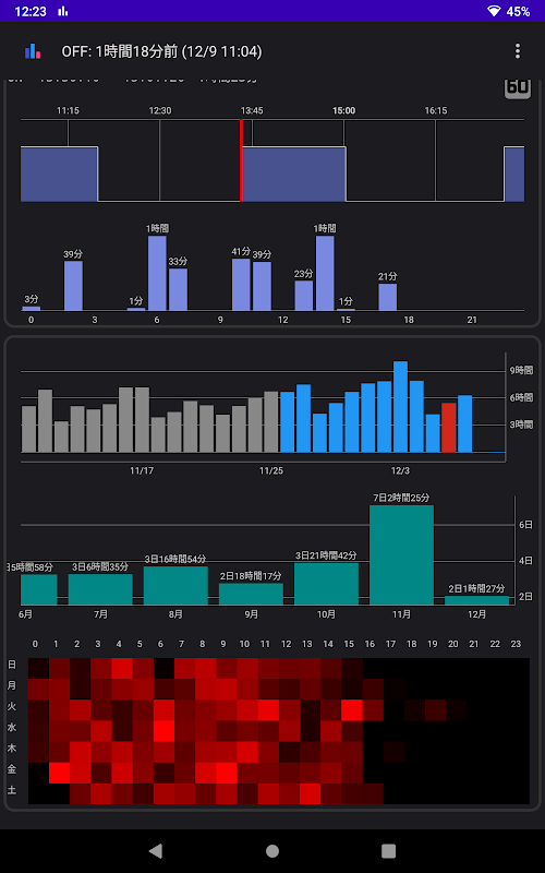 Możesz zapisać datę i godzinę korzystania ze smartfona i sprawdzić to na wykresie. Dotykając smartfona, możesz zobaczyć, o której godzinie zasnąłeś i ile czasu w ciągu dnia z niego korzystałeś. Dostępna jest również mapa cieplna, która pokazuje, w które dni tygodnia i godziny najczęściej z niej korzystasz.