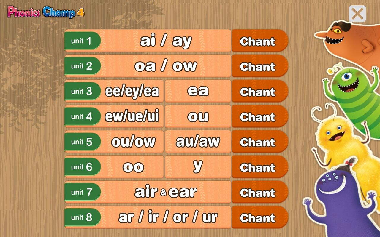 "Phonics Champ" jest wprowadzenie, początkujący, średni i zaawansowany cztery fazy, język angielski został zaprojektowany tak, aby szkolenie krok po kroku.