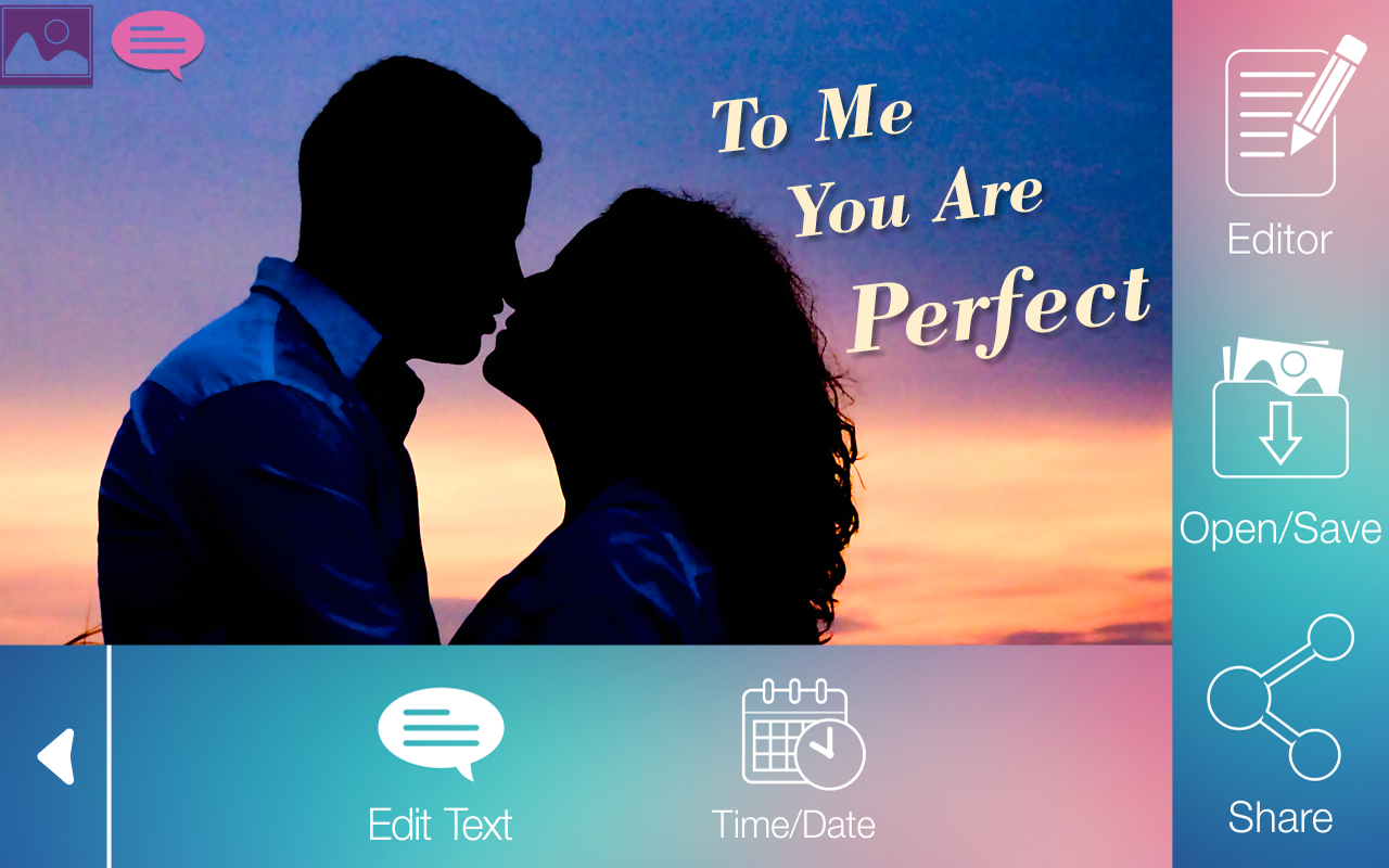 Podjęcie jakichkolwiek pic już masz w swojej galerii telefonu lub wybrać nowy pic. Skala i przenieść tekst, umieścić go gdzie chcesz na pic, zmiana koloru, zmiana czcionki, umieścić zarysie umieścić cień, zmienić krycie. Wybierz swoją ulubioną czcionkę na zdjęcia i cieszyć się z tego twórczego pisarza "zdjęć". Ten "pisać na zdjęciach" oprogramowanie daje wiele godzin zabawy! Edycja zdjęć w krótkim czasie, napisać na najnowszym Selfie i podzielić go na Instagram.