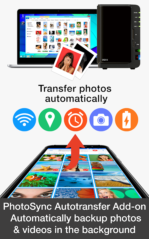• Bezpiecznie automatycznie przesyłaj zdjęcia i filmy bezpośrednio z systemu Android na dowolny serwer NAS, bezprzewodowe urządzenie pamięci masowej lub zdalny serwer przez SMB, (S)FTP lub WebDav. (Wymaga dodatku PhotoSync NAS — obsługiwane są wszystkie główne urządzenia NAS i mobilne urządzenia pamięci masowej!)