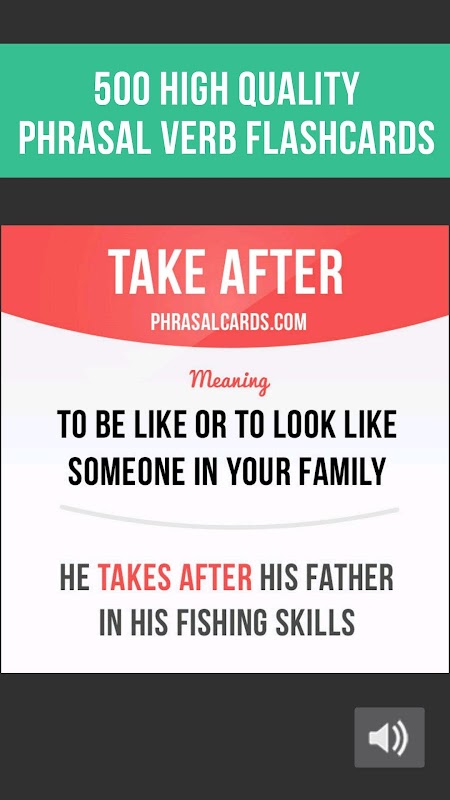 W naszej aplikacji znajdziesz 500 fiszek zawierających znaczenia phrasal czasownik, przykładowe zdania, zdjęć i poprawnej wymowy.