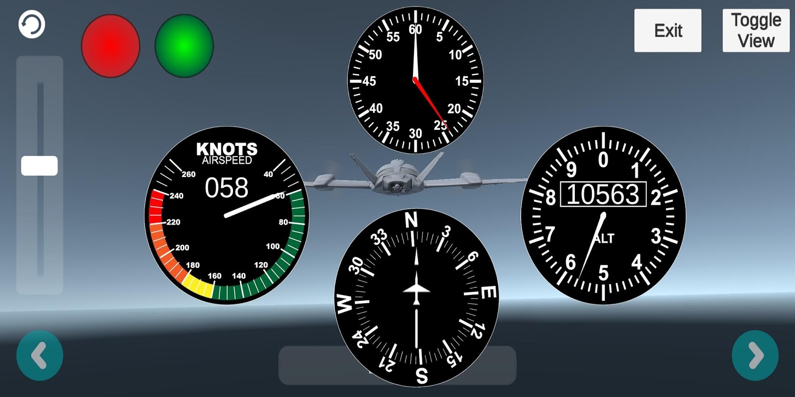 Sterowanie odbywa się za pomocą czujników żyroskopowych na urządzeniu mobilnym. Obrót do przodu i do tyłu kontroluje wysokość na wysokościomierzu (efekt Pitch), a obroty w lewo i w prawo (efekt Roll). Dwa przyciski Strzałki (lewy dolny, prawy dolny) sterują kompasem (efekt odchylenia).