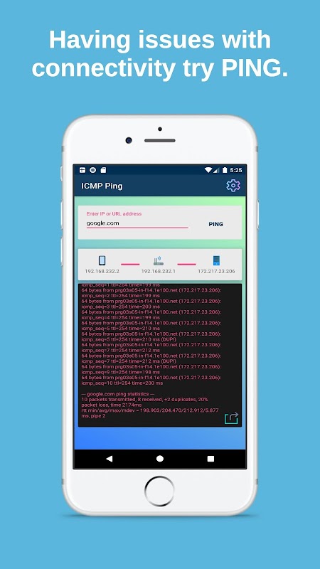 Aplikacja ICMP Ping to proste i czyste narzędzie sieciowe do uruchamiania poleceń ping z telefonu lub tabletu. Jest to łatwe w użyciu narzędzie Ping, ponieważ można uruchomić polecenie ping z adresami IPv4 lub IPv6 lub za pomocą nazwy hosta zdalnego serwera. Bardziej zaawansowani użytkownicy mogą ustawić dodatkowe parametry polecenia ping, takie jak interwał, rozmiar pakietu ICMP, liczba pakietów, TTL i wiele innych.