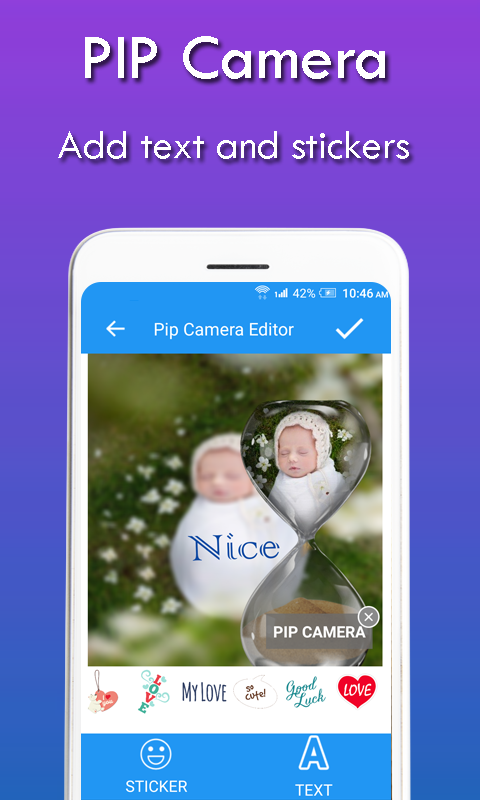 PIP Camera Photo Editor allows you to maker your photo in heart, glass, love, hand, mockup phone, board and more.