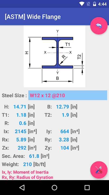 1. Standardowe Stal: Ta aplikacja ma wymiary standardowej stali, takich jak kąt, kanał, belki, rury tee i rury. Wszystkie stale są w standardzie ASTM, BS oraz JIS. Można wybrać stali według rodzaju i wielkości stalowej. To pokaże wymiary wysokość, szerokość, grubość, promień narożnika, moment bezwładności, promień bezwładności i moduł sekcji.