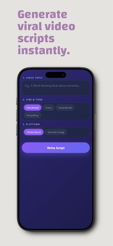 Wprowadź temat filmu, wybierz ton (Edukacyjny, Zabawny itp.) i wybierz platformę, taką jak TikTok lub YouTube.