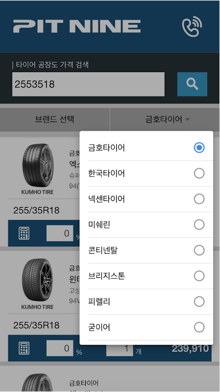 조회 결과 목록에서 타이어 공장도가 대비 할인율(%단위) 및 수량을 입력하여 간단한 계산이 가능합니다.