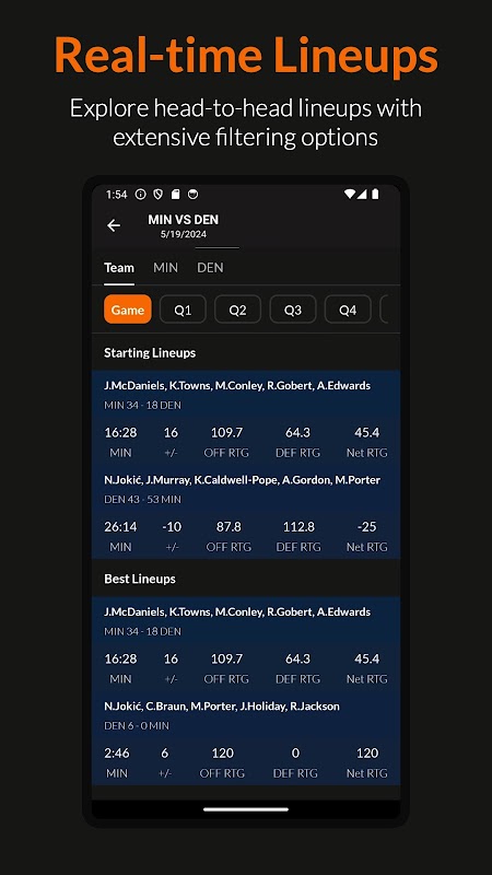 Konfigurowalne filtrowanie włączania/wyłączania: wybierz dowolną kombinację graczy ze swojej ulubionej drużyny, aby zobaczyć, jak radzą sobie na żywo w grze, przez cały sezon zasadniczy, po sezonie oraz w dowolnym odcinku meczów. Modyfikuj dalej, filtrując jednocześnie graczy przeciwników!