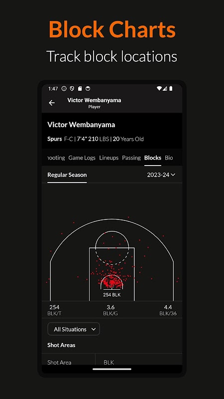 Dane dotyczące strzałów: zapoznaj się ze statystykami obszaru strzału i lokalizacji, a następnie porównaj je w całej lidze. Następnie przejdź dalej, analizując dane dotyczące strzałów z ataku z połowy kortu, możliwości szybkiego przełamania i rzuty drugiej szansy!