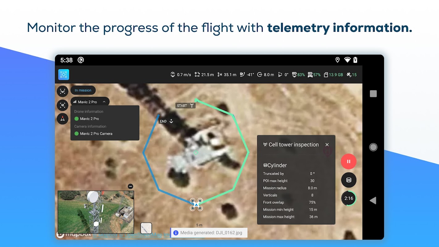 2- Rozpocznij i lataj - Śledź postępy swojej misji w widoku mapy lub monitoruj na żywo w widoku z kamery. PIX4Dscan dostarcza dane telemetryczne na żywo, takie jak wysokość, prędkość, kąt kamery i inne.