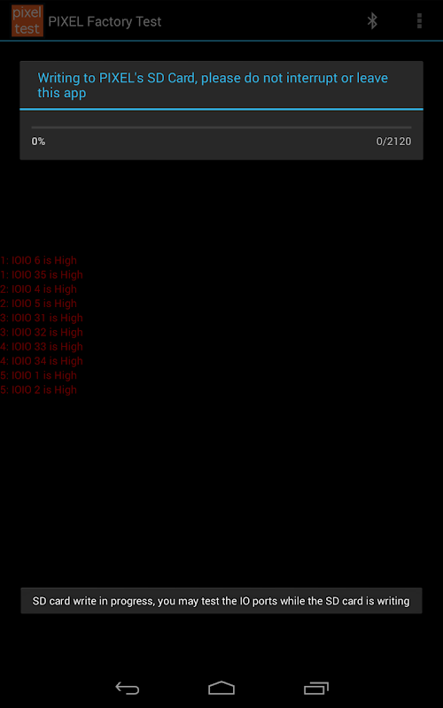 Ta aplikacja jest używana przez fabrykę, aby przetestować panel / CAT LED sprzęgła piksela, portów IO i zapisuje animację domyślną wbudowanej karcie microSD piksela. Użytkownicy końcowi mogą również korzystać z tej aplikacji, aby przetestować ich jednostek pixel.