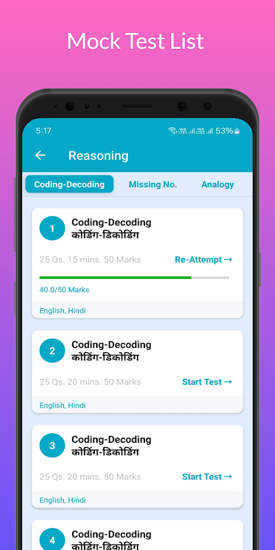 Aplikacja „Reasoning Notes & Mock Tests” zawiera także serię testów próbnych „Rozdział Wise” i pełną serię testów próbnych online PYP dla SSC CGL, CHSL, MTS, Steno, CPO, GD, AirForce, BSSC, Railway i wszystkich egzaminów konkurencyjnych. Te serie próbnych testów online są dostępne w języku hindi i angielskim.