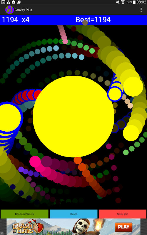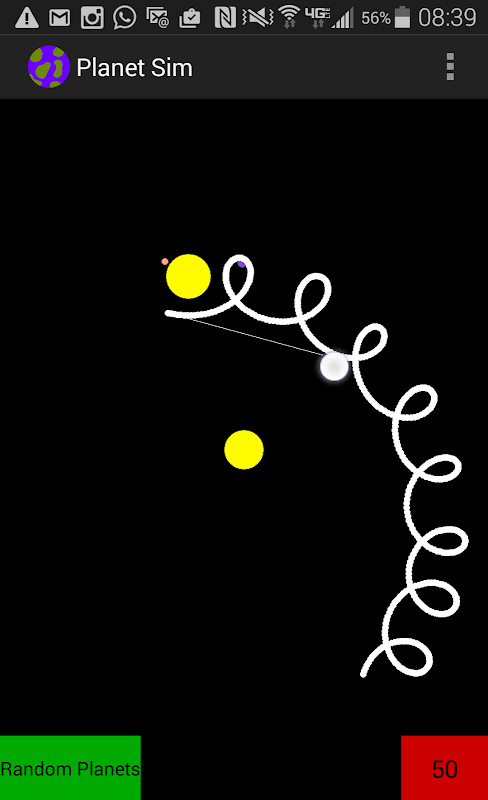 Play with planetary orbits in this fun exciting space physics sandbox. Try to make a solar system full of asteroids, moons, dwarf planets, giant planets, and suns. Touch the screen to add a planet. Drag your finger across the screen to give a planet a little bit of velocity. Enough speed will cause your planet to orbit. When planets collide, they combine together into a larger planet.