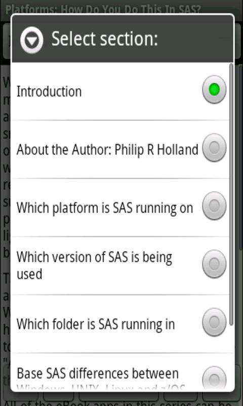 Ta aplikacja „Platformy:? W jaki sposób można to zrobić w SAS”, jest jednym z serii e-książki na temat programowania oprogramowania SAS koncentrując się na najczęściej zadawane pytania i odpowiedzi dotyczące SAS na Windows, UNIX, Linux iz / OS, zilustrowane za pomocą kodu próbki, które mogą być wysyłane przez e-mail bezpośrednio z aplikacji. Został on zaprojektowany, aby zachęcić użytkowników do przyczynić się niektóre pytania, które zostaną uwzględnione w przyszłych wersjach aplikacji. Są kontrole, aby wybrać konkretne pytania, przejść do poprzedniego lub następnego pytania, zmniejszenia lub zwiększenia czcionki do własnych preferencji użytkownika i wysyłać e-maile z żądaniem odpowiedzi na pytania nie są jeszcze uwzględnione w tej wersji eBook.