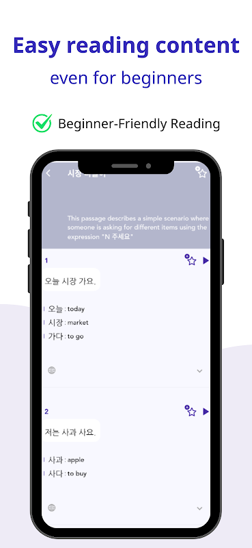 Każde zdanie jest krótkie i łatwe do zrozumienia, z tłumaczeniami i dostarczonym dźwiękiem rodzimego użytkownika.