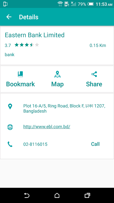- Displaying detailed information of places is another feature of Pointers such as contact information, website, place ratings, location details, distance etc.