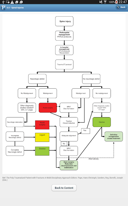- Leczenie chirurgiczne algorytmy zapewniają szybki przegląd strategii w leczeniu różnych urazów i podejmowania decyzji klinicznych (głowa, klatka piersiowa, brzuch, biodra, długie złamania kości, kręgosłupa, nerek i dróg moczowych)